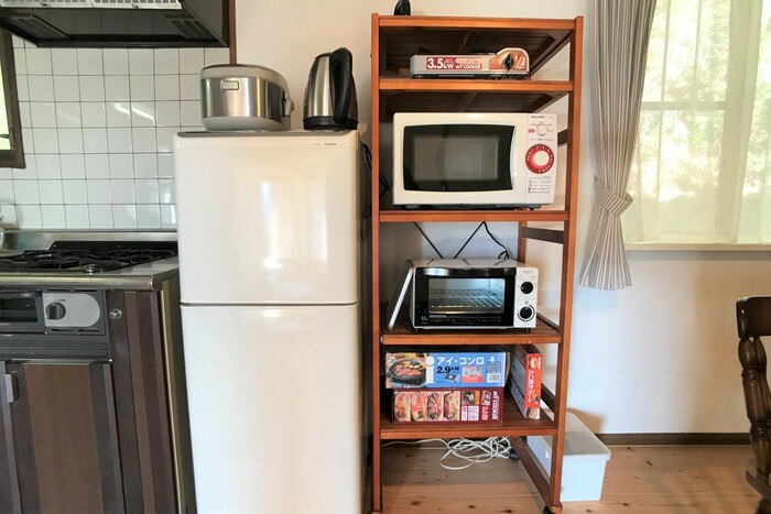 無料Wi-Fi、ベッド、布団、タオル、歯ブラシ、シャンプー、ボディーソープ、ヘアドライヤー、ハンガー、アイロン、洗濯機、エアコン、キッチン、調理器具、食器類、調味料(油、塩、胡椒、醤油)、電子レンジ、トースター、炊飯器、電気ケトル、冷蔵庫、敷地内無料駐車場