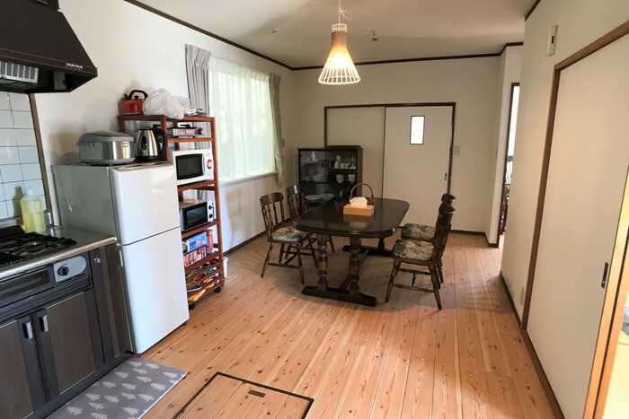 北外輪山の中腹に立地し、眼前には阿蘇カルデラの田園風景と阿蘇五岳が広がる貸切一軒家。和室2部屋、洋室1部屋があります。和室は熊本県八代産のい草の畳を使用し、掘り炬燵を設置しています。洋室には、シングルベッドが2つあり、阿蘇の間伐材を使用したフローリングです。L字型のキッチンのあるダイニングには、調理器具や食器類と複数人で料理可能なスペースをご用意しています。