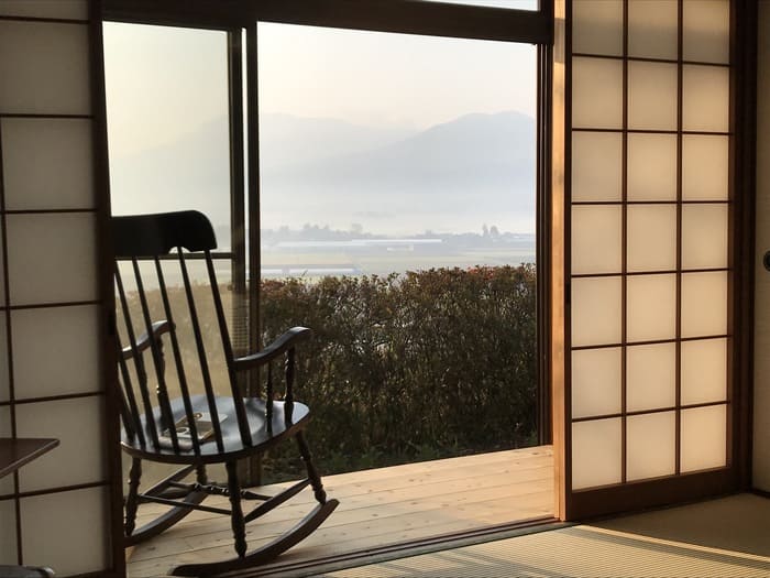 北外輪山の中腹に立地し、眼前には阿蘇カルデラの田園風景と阿蘇五岳が広がる貸切一軒家。和室2部屋、洋室1部屋があります。和室は熊本県八代産のい草の畳を使用し、掘り炬燵を設置しています。洋室には、シングルベッドが2つあり、阿蘇の間伐材を使用したフローリングです。L字型のキッチンのあるダイニングには、調理器具や食器類と複数人で料理可能なスペースをご用意しています。