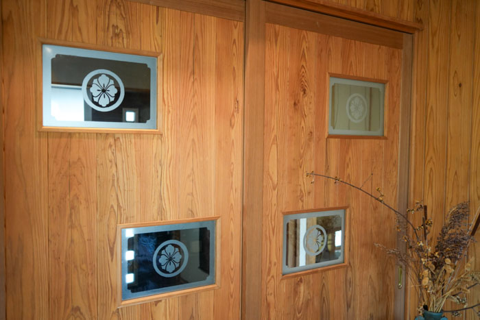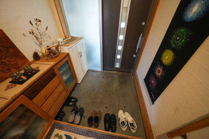 小石を埋め込んだ土間と塗り壁が印象的な玄関。リビングの引き戸には、奥様のご実家で使われてきた家紋入りのガラスをはめ込み、和モダンな雰囲気に。