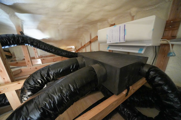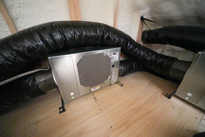 屋根裏には太いダクトが巡り、エアコン・熱交換器・送風ファンユニットが設置されています。
