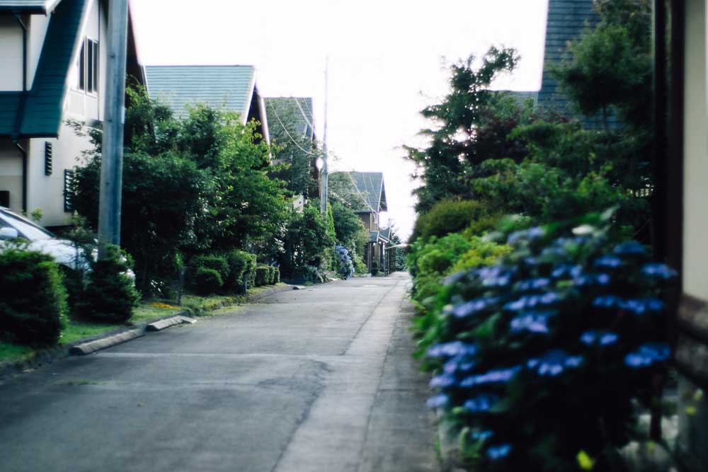 森の中から家の片鱗がちらりと覗いているポツンと感。しかし、山道を登り切った先には、綺麗にたくさんの家が軒を連ねていました!あまりのギャップに、狐につままれたよう。それほどまでに、森を抜けた瞬間に明るく清々しい雰囲気の住宅地が現れます。(のちにわかったことですが、他にもう少し道幅の広く傾斜の緩い、別ルートもありますのでご安心を)