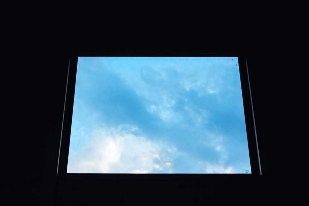 吹き抜け部にある明かり取りの大きな窓が空を切り取っている!もはやアートです。