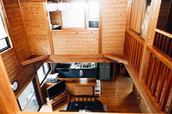 二階も覗いてみましょう。吹き抜けから見下ろした図。無垢材が使われた室内。暖かみと開放感が両立。