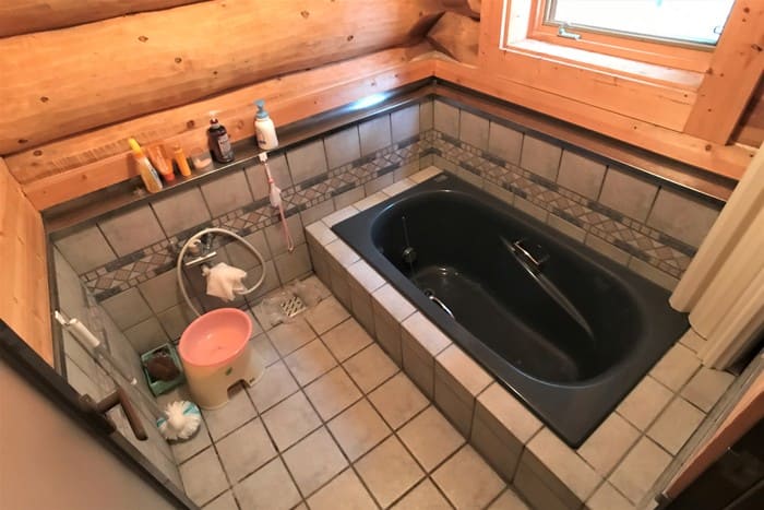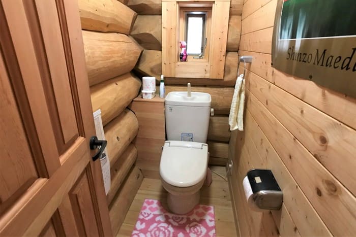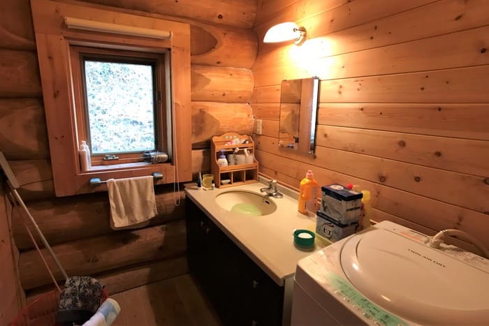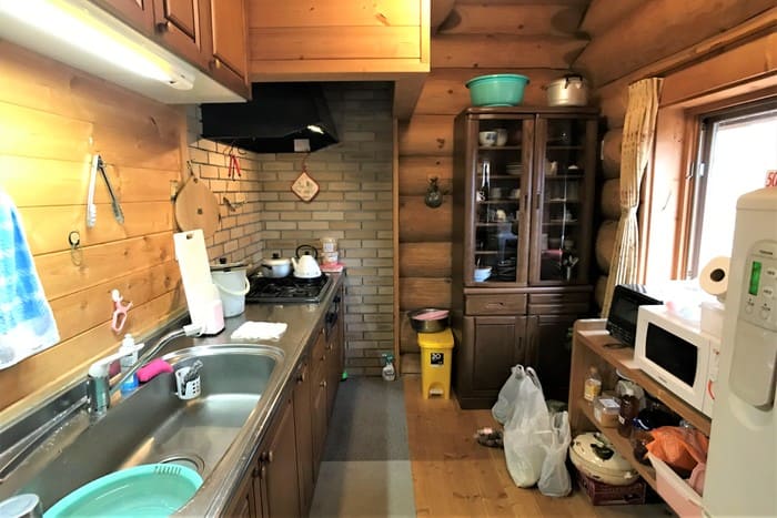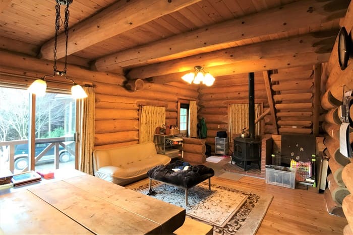 玄関に入ると、ログハウス特有の心地よい木の香りが出迎えてくれます。外壁も丁寧にメンテナンスされているので築20年とは思えません。このログハウスは、カナダ製。職人がハンドカットして、組み立てながら微調整したものを、一度バラして日本に運んで組み立てなおしたもの。施工したビッグフット(現在はBESS)は九州にいくつも支店がある会社ですのでメンテナンスも安心ですね。
