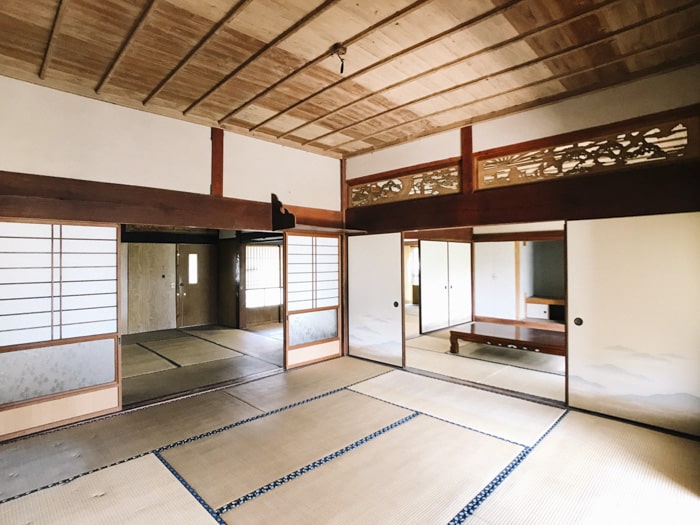 一部フローリングに改装されている部屋もあります。古民家ならではなのは天井の高さ。それを活かして既存の壁や天井を取り払いさらに空間のボリュームを大きくし、できるだけ光を取り込むようにすれば劇的に雰囲気はかわることでしょう