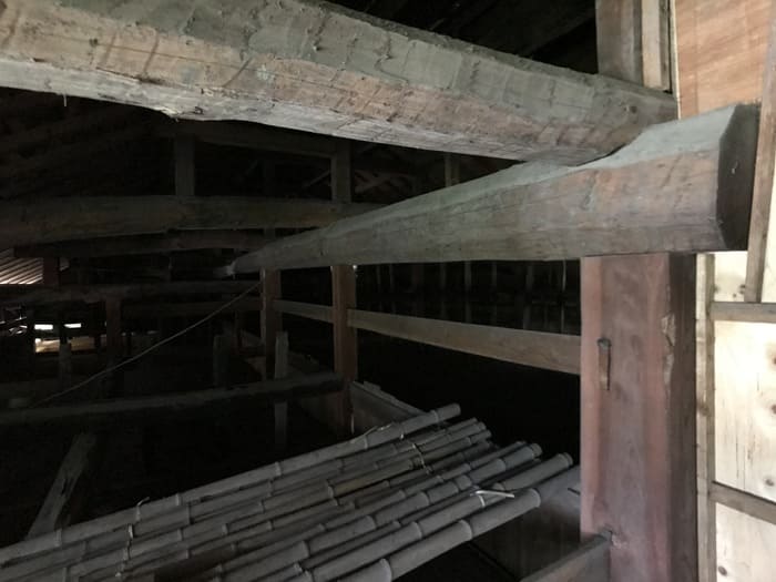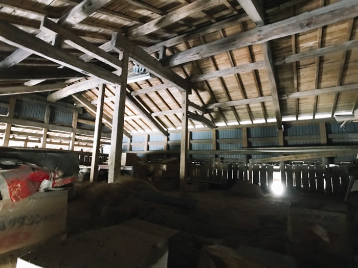 母屋の隣には、母屋と同じくらいの広さがある納屋もあります。大きな木材が使用されていて、母屋よりも頑丈なんじゃないかと思うほど立派で、以前は農耕用の牛や馬が飼われていました。