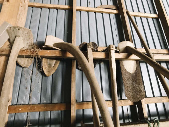 納屋の内部。天井に竹や木材が干してあります。自由につかえる作業場は憧れです