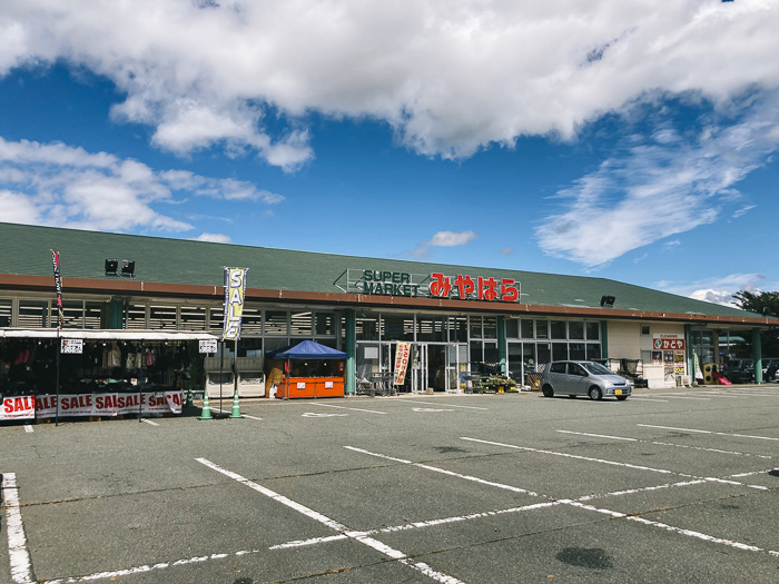 道路を挟んでコンビニとスーパーが並列にならぶ。多くの地元の人が利用する「みやはら」には生鮮食品はもちろん、地元の産物も購入可能。