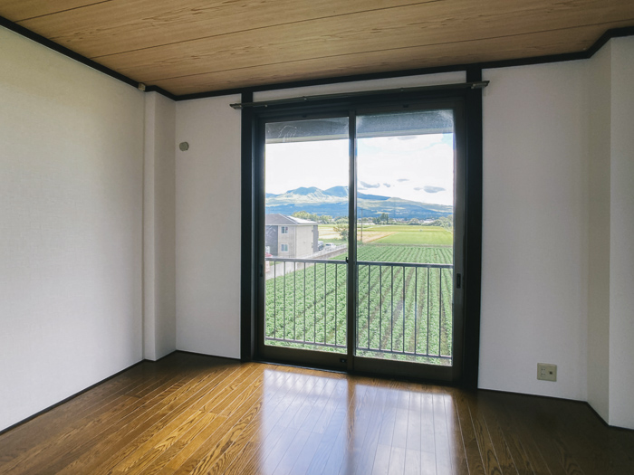 2階の南側の窓からは、ザ・阿蘇という風景が一望できます。阿蘇山がこれだけきれいに見えるのはなかなかありません。四季折々のダイナミックな阿蘇の風景に包まれるのが阿蘇暮らしの醍醐味です