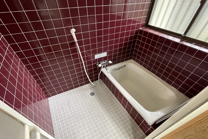 洗面台は新しく交換。浴室はワインレッドのタイルがシックでいい感じ。朝の身支度や疲れを癒すバスタイムを、気持ちよく過ごせそう。