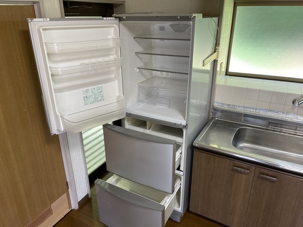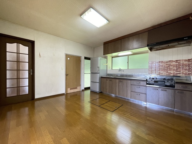 田の字型に仕切られた空間の残り一つが、こちらのダイニングキッチン。料理がはかどりそうな収納たっぷりのキッチンに、床下収納付き。少し使用感はあるものの、大型冷蔵庫まで付いています!
