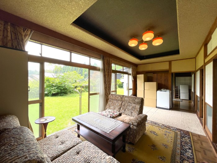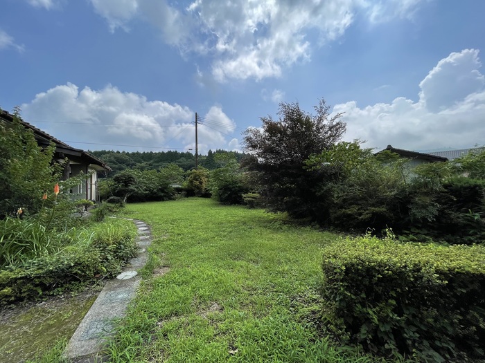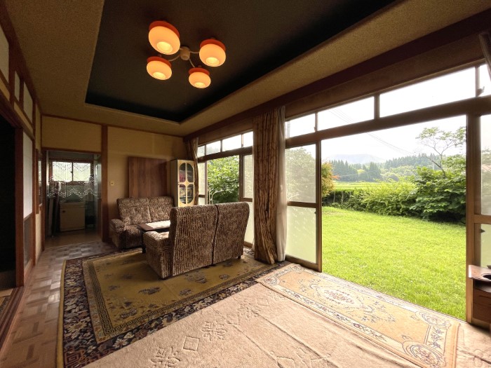 縁側の前に広がる芝生の庭。この抜け感がたまりません。そのままフリースペースとして使っても良いですし、畑にして家庭菜園を楽しむことも。視線を遠くに向けると、阿蘇山の並びに米塚(こめづか)を見つけることができます。