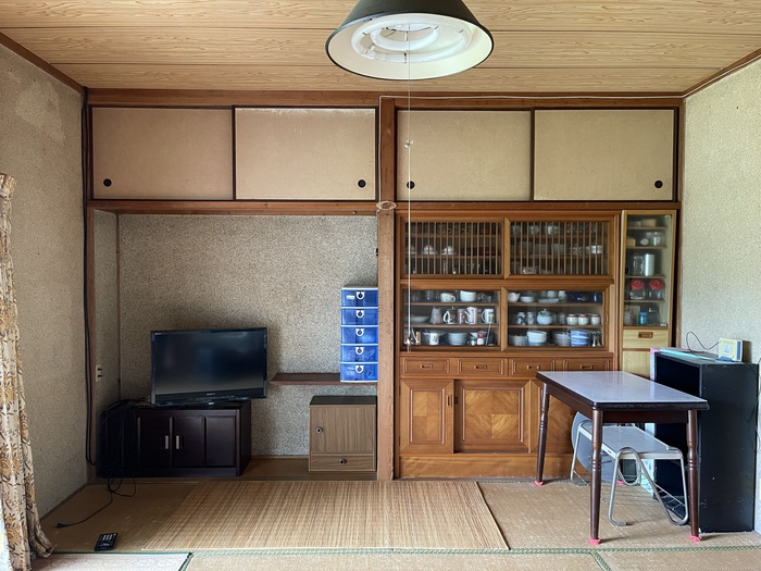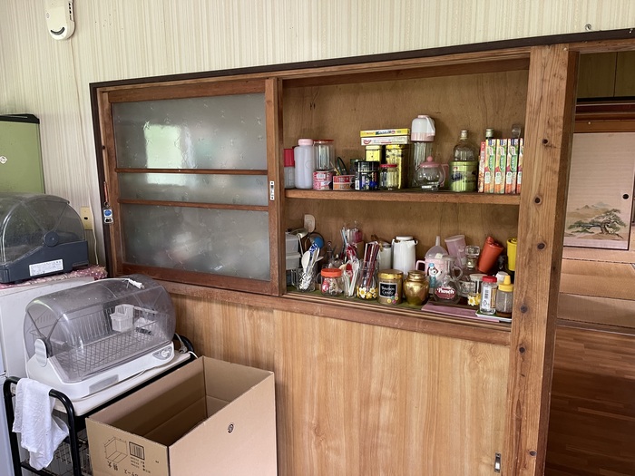 壁にぴったりフィットした食器棚と天袋が、昭和の情緒たっぷり。