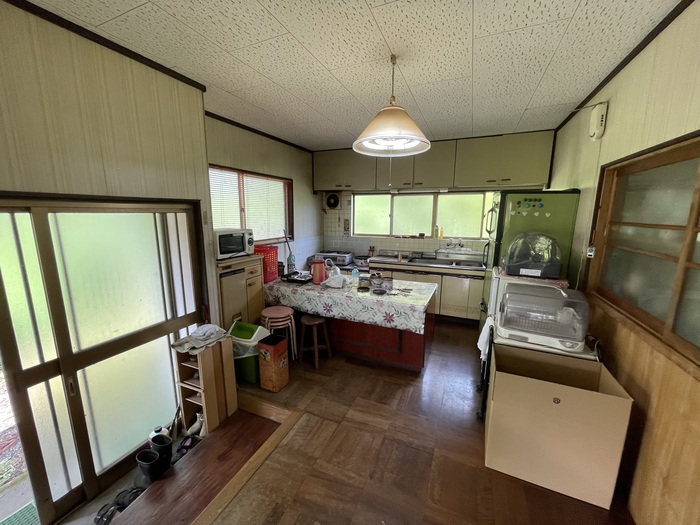 そして、前述の8帖和室とつながっているのが、ダイニングキッチン。こちらも8帖ぶんのスペースがあるので、中央にダイニングテーブルを置いても良いですし、作業台を置いて、そば打ちやパンづくりにもトライできそう。外から出入りできる勝手口があるので、食材をたくさん買い込んだときに便利です。