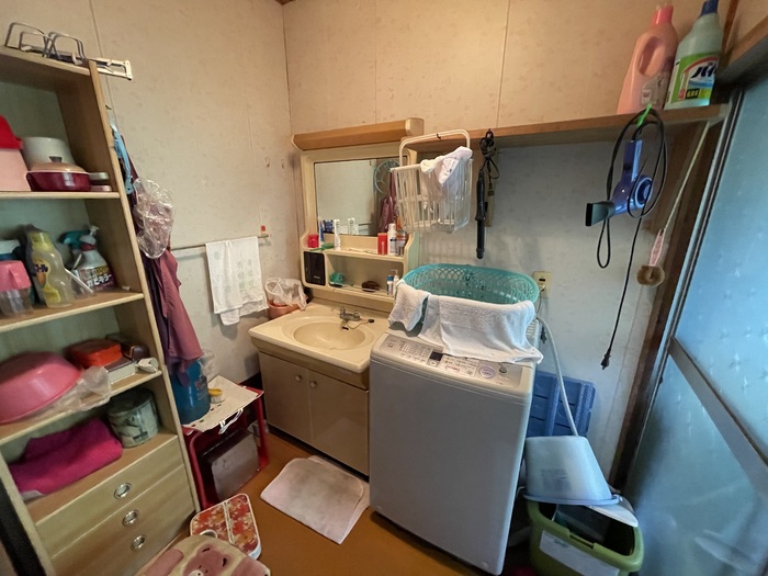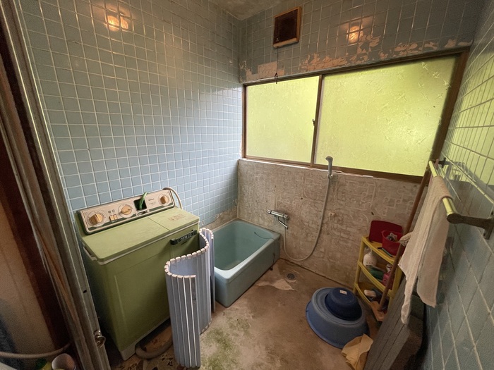 こちらは、浴室と脱衣所。それなりの経年劣化は否めませんが、余分なモノを撤去してしまえば、広々と使えそう。浴室のタイルや床、脱衣所の壁あたりをリフォームすると、垢抜けた印象になりそうです。