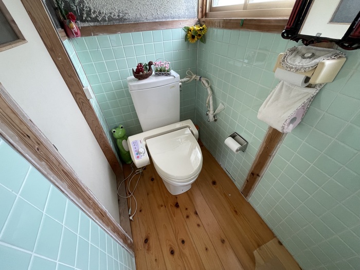 自動洗浄器付き水洗トイレ。足を伸ばしても余裕の広さ。
