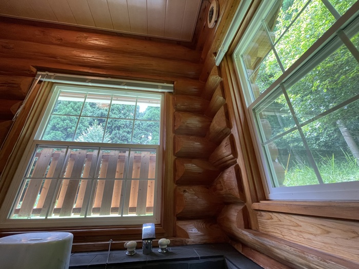 さらに浴室をのぞいて見るとビックリ!浴室の壁まで丸太で囲まれたログハウス仕様となっています。深めの浴槽にゆったり浸かって窓の外を眺めれば、こちらからも美しい森が。