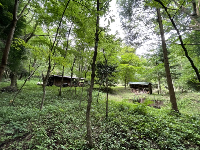 森の中から見た母屋と作業小屋。撮影している場所もまるごと敷地!