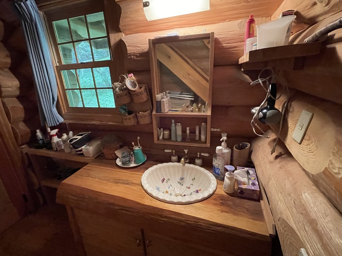 キッチン背部の壁を隔てたところにはバスルームがあり、フランス製の洗面ボウルを据えた造作の洗面台がログハウスの雰囲気にぴったり。