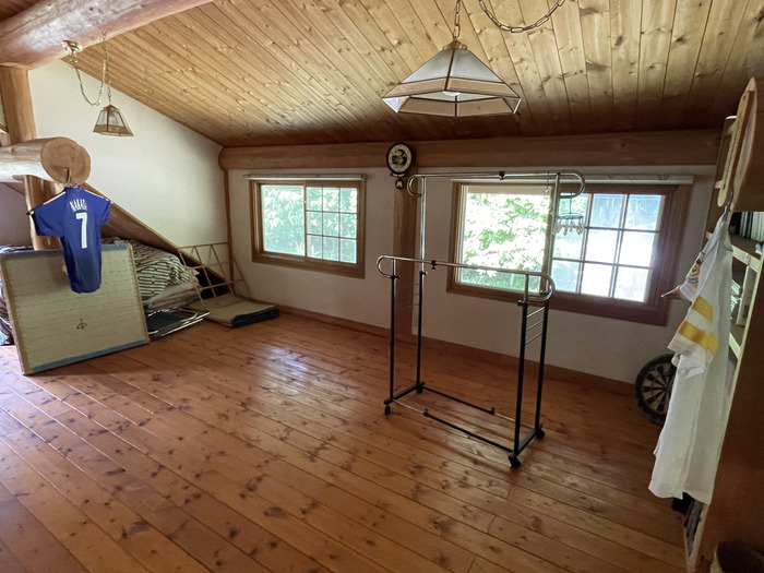 屋根裏といっても14.5帖もの広さ。現オーナーさんはゲスト用の寝室として使われていたそうです。室内干しにも重宝しそう。手すり越しに1階全体を俯瞰できるのも楽しいです。天井に設置されているシーリングファンが室内の空気を循環させてくれるので、寒さが気になる冬でもエアコン1つと薪ストーブで過ごせていたそう。