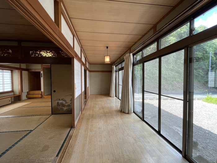 左画像は玄関から見た西向きの広縁、右が2間の和室に面した南西向きの広縁。雑巾掛けをするうちに、足腰も鍛えられそう!