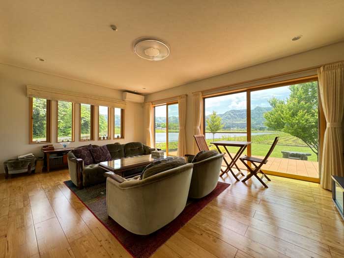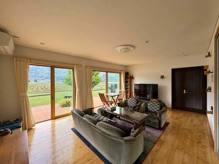 続いてリビングへ。足を踏み入れた瞬間、目に飛び込んできた空間に度肝を抜きました。阿蘇の眺望を余すところなく享受できる窓と、外のテラスへ広がる繋がる足元。室内にいながら自然と一体になれる気分でファンタスティック!