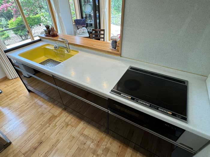 日本有数の楽器メーカー、ヤマハの技術を用いたシステムキッチンは高品質な塗装が特長。食器から調理器具までおさまる収納も魅力で食器をコレクションしているご家庭は大助かり! キッチンとダイニングを仕切るカウンターには幅30cmの一枚板を採用し、大皿を並べたり食材を置いたりと重宝します。