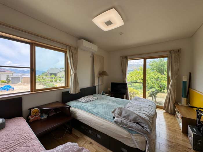 寝室から見渡す北側の窓からは根子岳、中岳といった阿蘇山を構成する山々を一望。