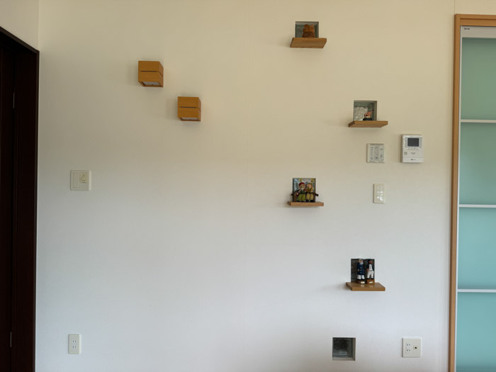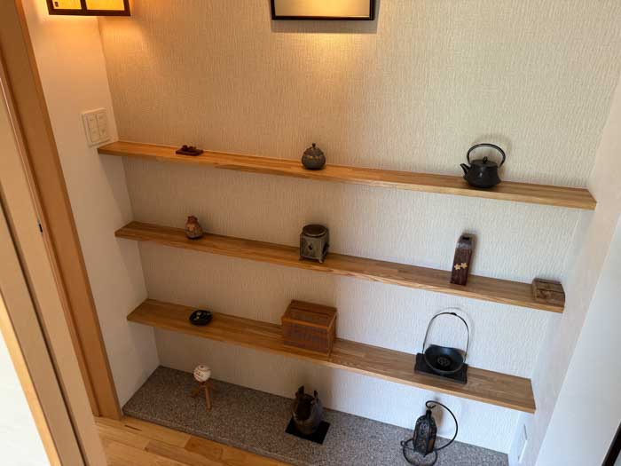 廊下に設けた飾り棚。お気に入りのコレクションを並べたり、外出で忘れたくない普段使いの小物を置いたり。アイデア次第でいろんな使い方ができそう。