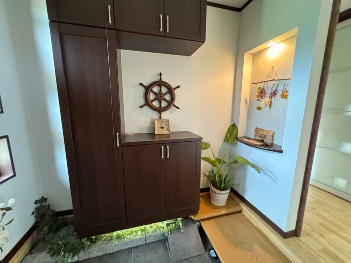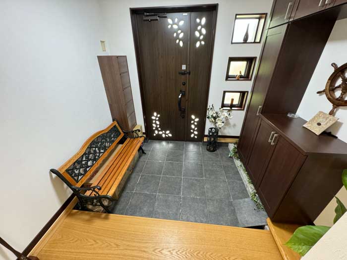 玄関の奥行きはベンチを置ける広さがあり、透かし掘りを施した扉とその隣に配した明かり取りから差し込む光がコントラストを描きます。下駄箱の足元や飾り棚にもさりげなく間接照明が施されています。