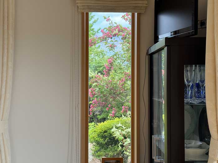 ダイニングの隅に設けた縦長い窓が額装の役目を果たし、ベニウツギの花が部屋に色彩をもたらしていました。なんて小洒落た演出。
