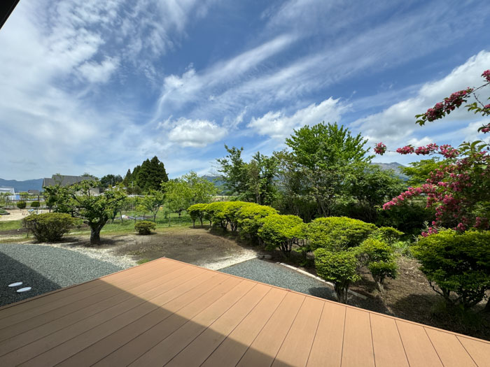 リビングに面した南側のデッキは奥行き2メートル。取材で訪れた5月、左手には田植え前で水を張った田んぼが広がっていました。チェアタイプのハンモックを置いて日向ぼっこしたい!