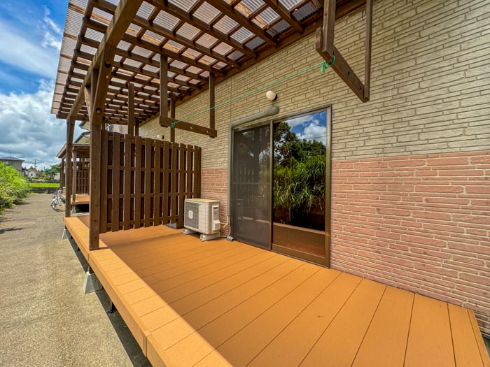 各お部屋の1階部分にはウッドデッキが設置されています。ウッドデッキと同じ幅の屋根が付いているので、突然の雨でも洗濯物の心配をする必要がありません。