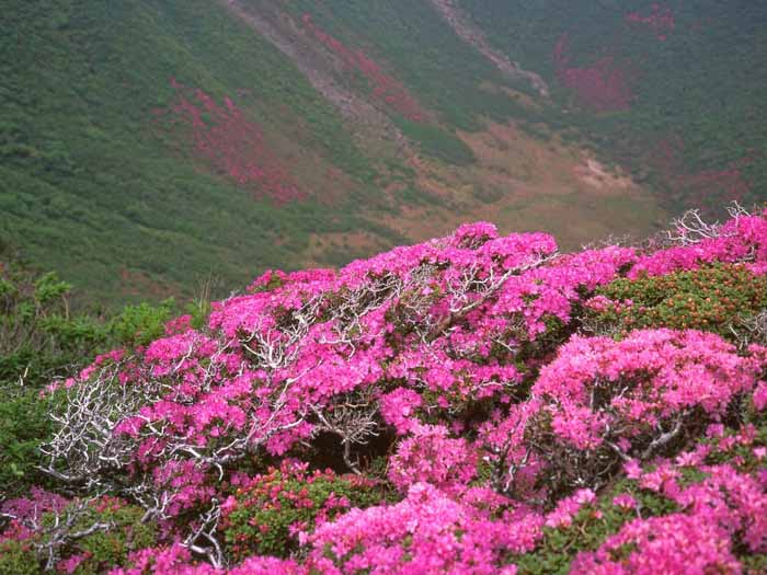 阿蘇山の麓にある渓谷のことで、数万年前に阿蘇山が噴火した際の溶岩流が形成したと言われています。ここには九州の火山地にだけ生息するミヤマキリシマが約5万株も自生しており、5月中旬に一帯のミヤマキリシマが満開になると、山肌が一面ピンク色に染まる美しい景色を見ることができます。