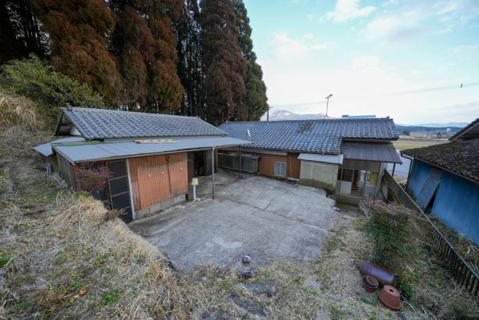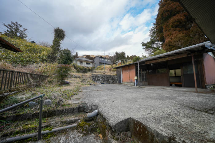 続いては、母屋の裏手に移動してみましょう。少し高台となった場所に離れ(納屋)が一棟、さらに高台には畑があります。離れには5.5帖ぶんのフローリングと土間があり、もともとはこちらを母屋として売主さんは3歳まで住んでおられたそう。