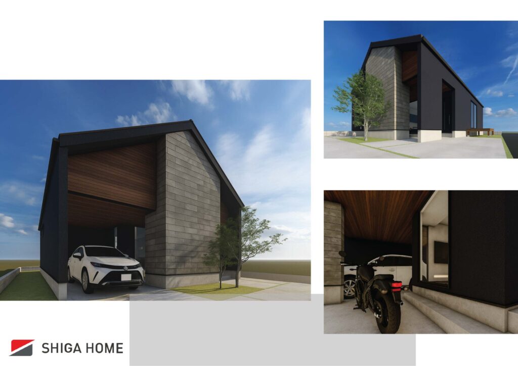 リビングでお酒を片手に、ガレージに鎮座する愛すべきバイクや車を眺めたい…。そんな理想をかたちにした、まさに大人の隠れ家的な間取り。デザイン性の高い設計が得意な若手の設計士さんによるプランニングです。