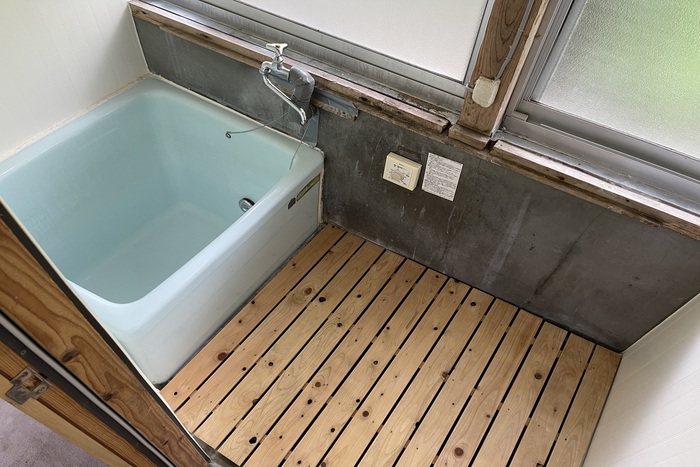 お風呂はバランス釜タイプです。浴槽に水を張って、沸かしてから使います。トイレは壁にはタイル、床にはクッションフロアを張り、汲み取り式ですが清潔感を感じられる仕様です。