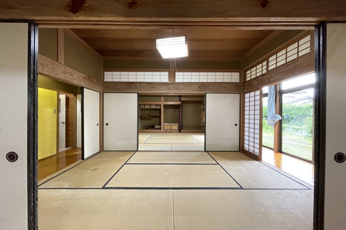 ご紹介した2つの和室と廊下を挟み、さらに和室がもう一部屋。新しく張り替えた黄色の壁紙がモダンです。ガラス戸を外してダイニングキッチンと繋げて使えば、16帖分もの広さ!