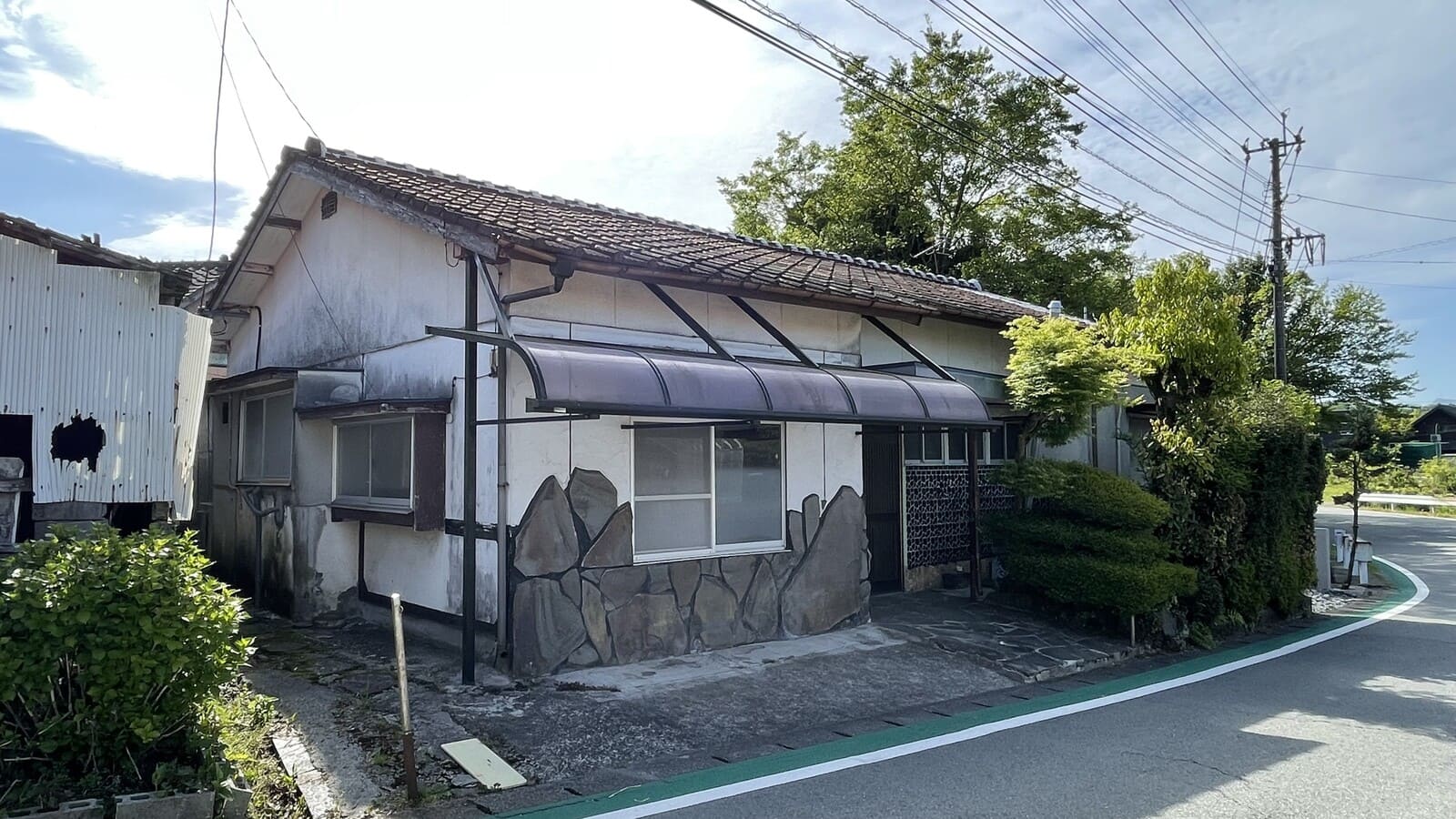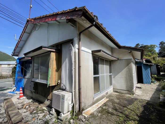 なお、建物向かって右側に部屋を増築していた部分がありましたが、今回の売却のタイミングで解体をされました。そのため、部屋があった部分の外壁をブルーシートで覆っています。