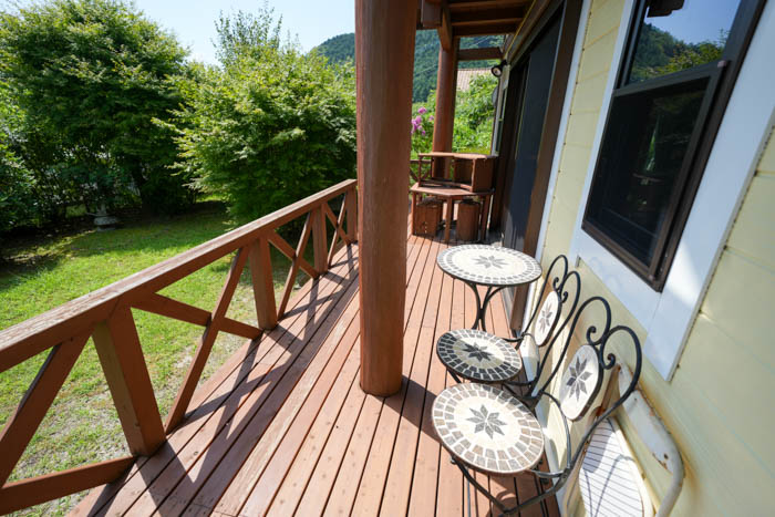 広々としたウッドデッキから自然を眺めながら、のんびりとティータイムを過ごしたい。