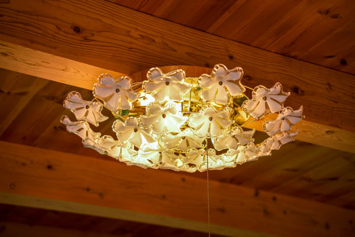 吹き抜けの天井にはシーリングファンとシャンデリア、ダイニングにはフラワーモチーフの照明が取り付けられ、ウッディーな室内の雰囲気にぴったり。