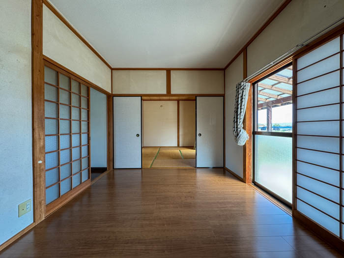 では、家の中を見てみましょう。間取りは洋室2つと和室1つにダイニングキッチンの3DK。もともとは3室すべて和室でしたが、2部屋を木目のフローリングへとリフォームしました。洋室にした南側の部屋とダイニングの引き戸を外せば、2LDKのように使用することもできちゃいます。