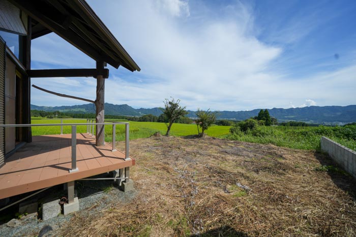 ウッドデッキからは、南阿蘇の牧歌的な風景を感じられます。