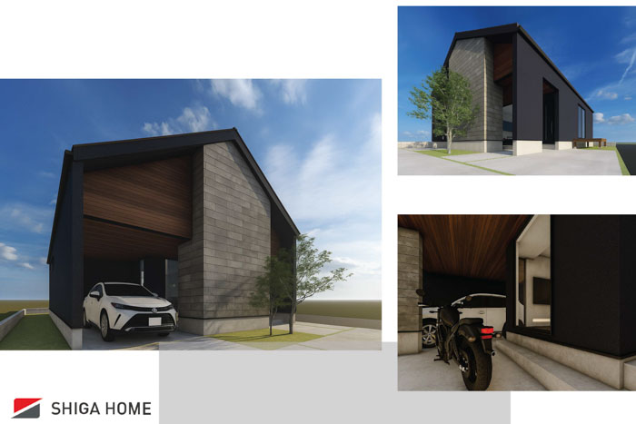 リビングでお酒を片手に、ガレージに鎮座する愛すべきバイクや車を眺めたい…。そんな理想をかたちにした、まさに大人の隠れ家的な間取り。デザイン性の高い設計が得意な若手の設計士さんによるプランニングです。