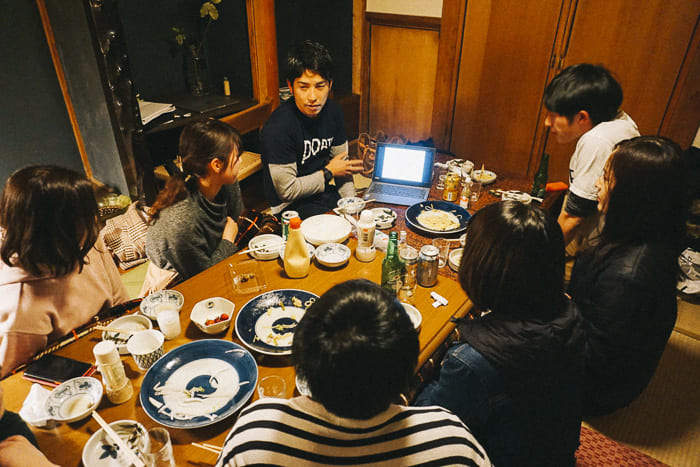晩御飯を食べながらの社内ミーティング。食事をしながら堅い話をしても大体締まらない