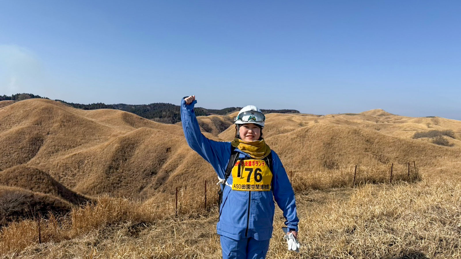 かいもえです。漢字で書くと甲斐萌です。野焼き研修に参加した時の写真ですが、火消し棒は長すぎて見切れています。