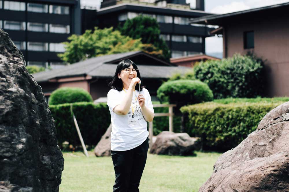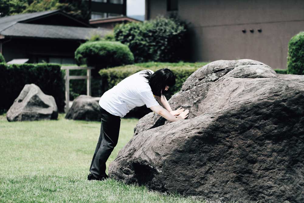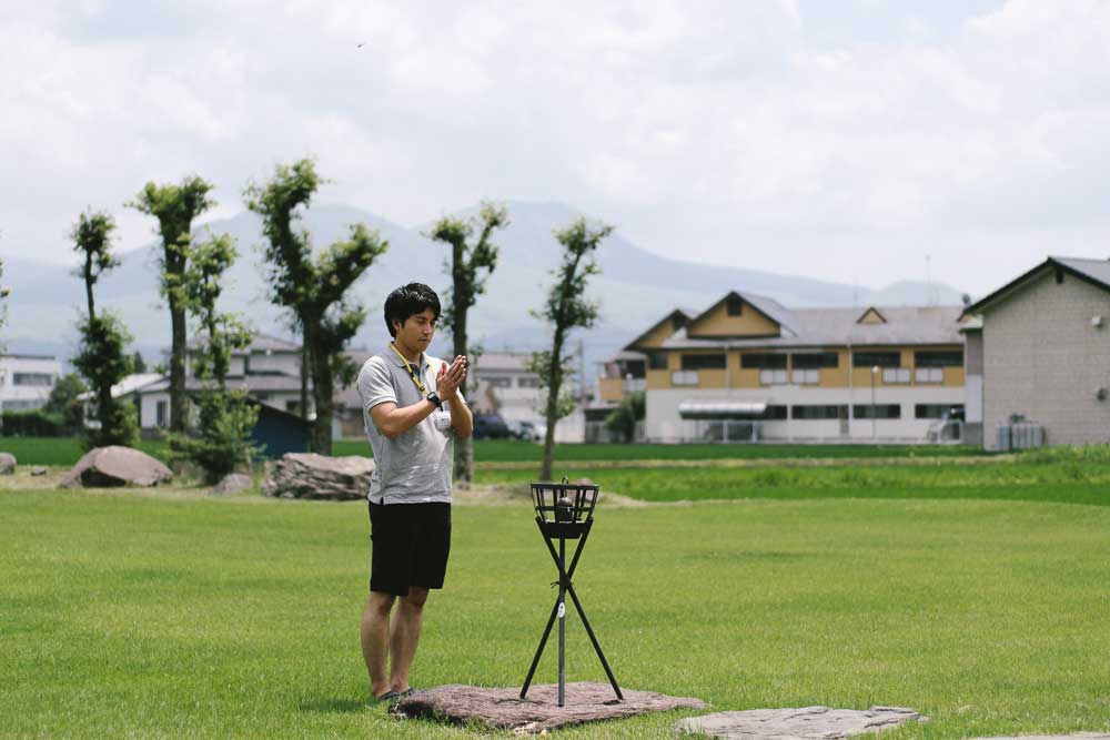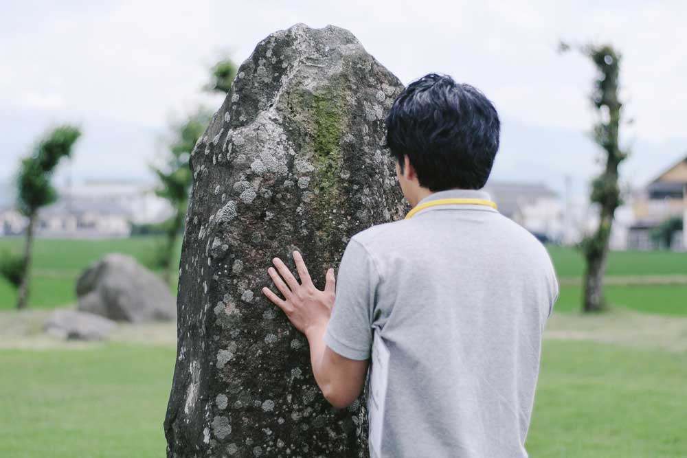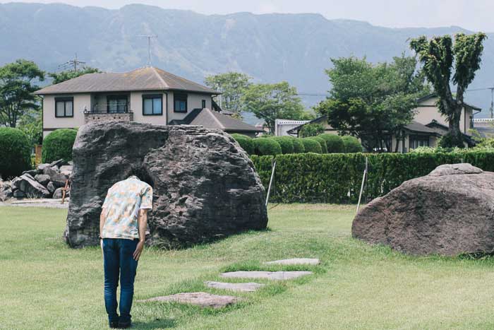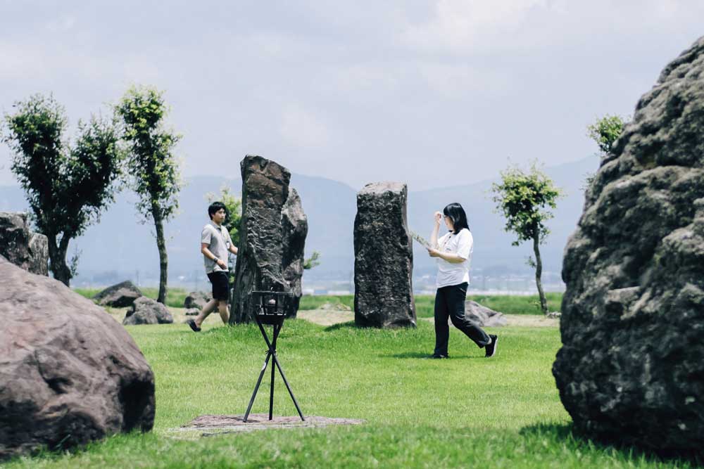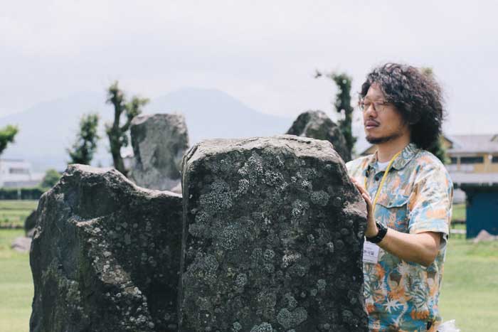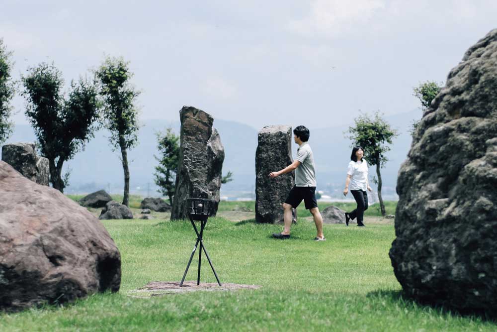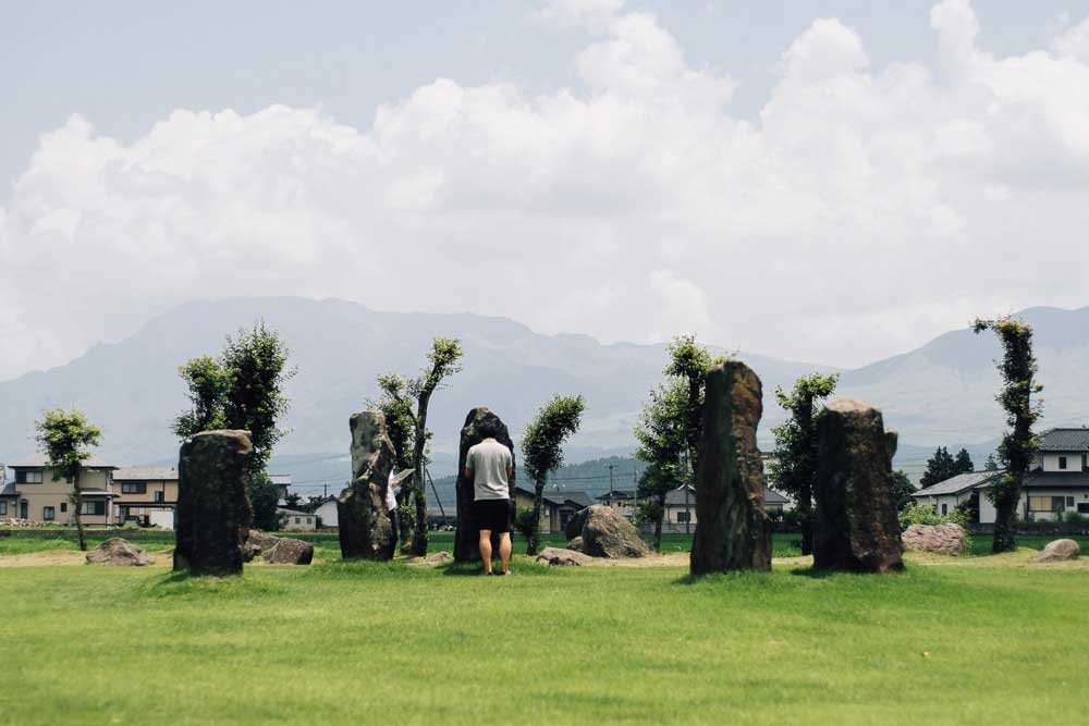 さらに、ライター忽那(くつな)も加えて挑戦する。巨石と外輪山のコントラストは、過去と未来が同時に存在しているような不思議な錯覚になる。そんな不思議で開放的な場所を説明書片手にクルクルと回る。このクルクルが秘儀なのだ。詳細は現地で体感すべし。