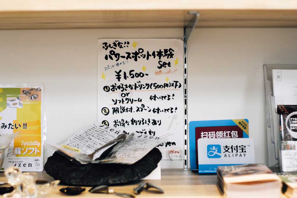 パワースポット体験は1,500円。丁寧な解説とお好きなドリンクか、cafe zenの目玉でもある、ミルク感たっぷりな「阿部牧場謹製 濃厚絶品ソフトクリーム」も付いている。目の前には、おしゃれカフェにそぐわない、ぐねぐねに曲がったスプーンが無造作に転がる。このギャップをすぐには処理できまい。